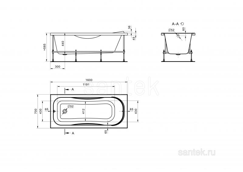 Ванны Santek производятся из 100% литьевого акрила, что обеспечивает длительную эксплуатацию изделия и полностью исключает опасность расслоения. Ванны долгое время сохраняют тепло, обладают стойкостью к химическим и физическим воздействиям, легки в уходе. Белоснежно-белый цвет акрила идеально совпадает с цветом керамики Santek. Усовершенствованная конструкция металлического опорного каркаса ванн Santek придает надежную устойчивость конструкции, новый способ крепления панелей к ванне гарантирует привлекательный внешний вид, легкость и простоту сборки. Акриловые ванны Santek дополнительно поставляются в комплекте с фронтальными и боковыми панелями, каркасом, системой слив-перелив с сифоном, креплениями ванны к стене и комплектом креплений фронтальной панели. Ванна может быть укомплектована одним из 4х видов гидромассажа. Возможна комплектация упрощенным каркасом (ножки).
