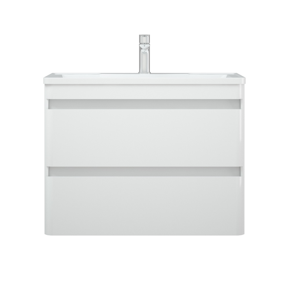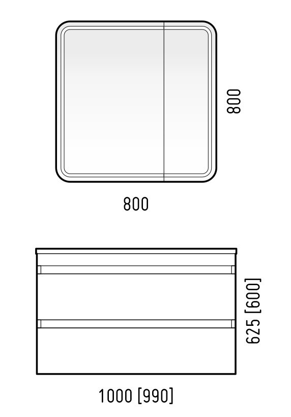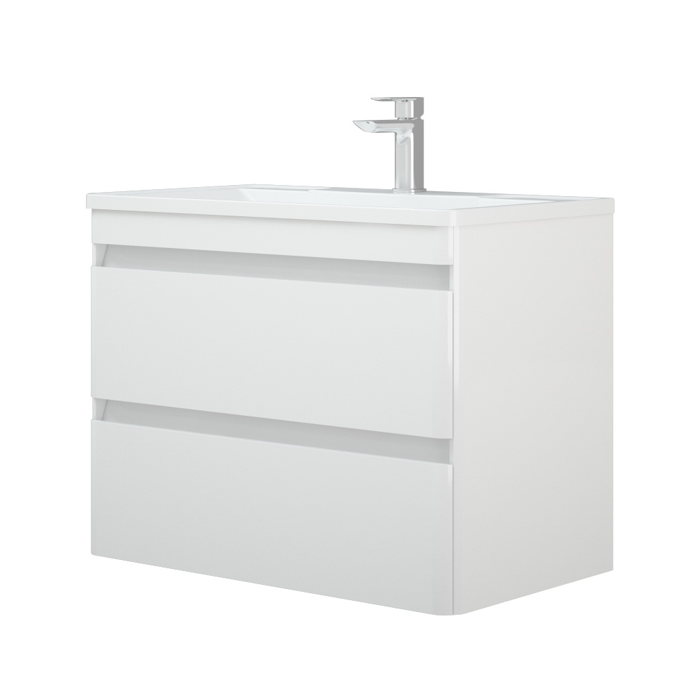 Подвесная тумба имеет интересный эргономичный дизайн - скругление боковин плавно переходит в скругления на фасадах. У тумбы 2 выдвижных ящика на направляющих скрытого монтажа с доводчиками. Нижний ящик цельный, верхний разделен на 2 отделения, с местом под коммуникации посередине. Верхний ящик высотой 100 мм с выпилом под коммуникации, нижний высотой 170 мм. Коромысло, боковины, фасады - МДФ в плёнке. Фасады не имеют ручек, конструктив тумбы позволяет открывать фасады без использования ручек.
