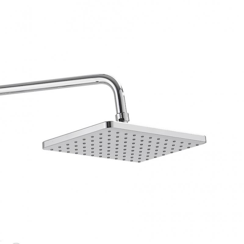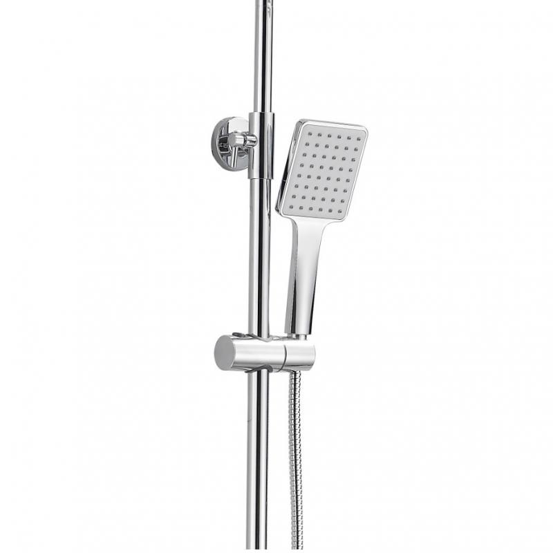 - Комплектация: смеситель, верхний душ, душевая лейка, держатель душевой лейки, шланг, стойка