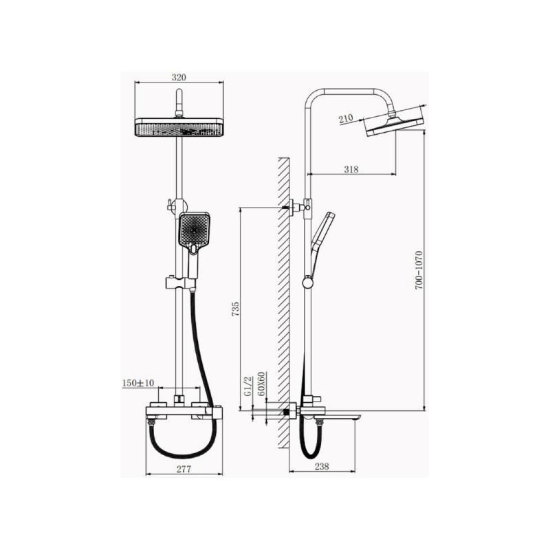 - Комплектация: смеситель, верхний душ, душевая лейка, держатель душевой лейки, шланг, стойка