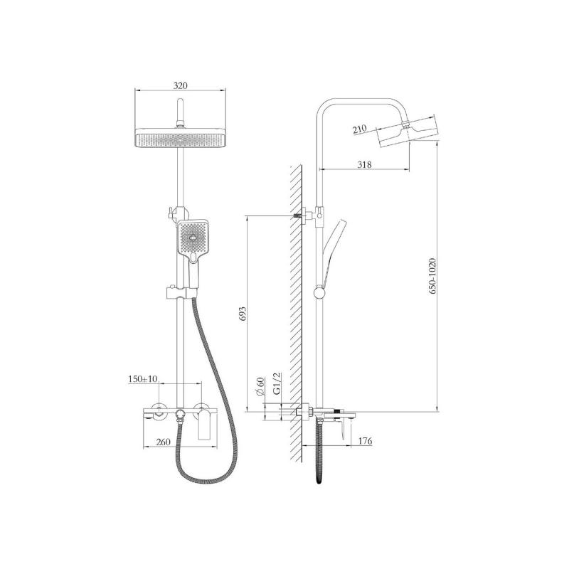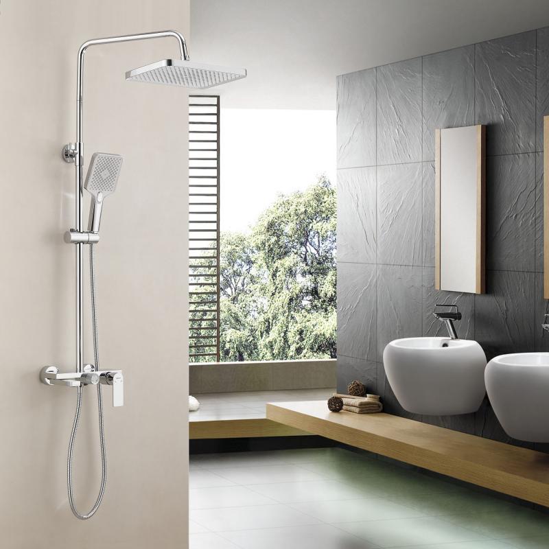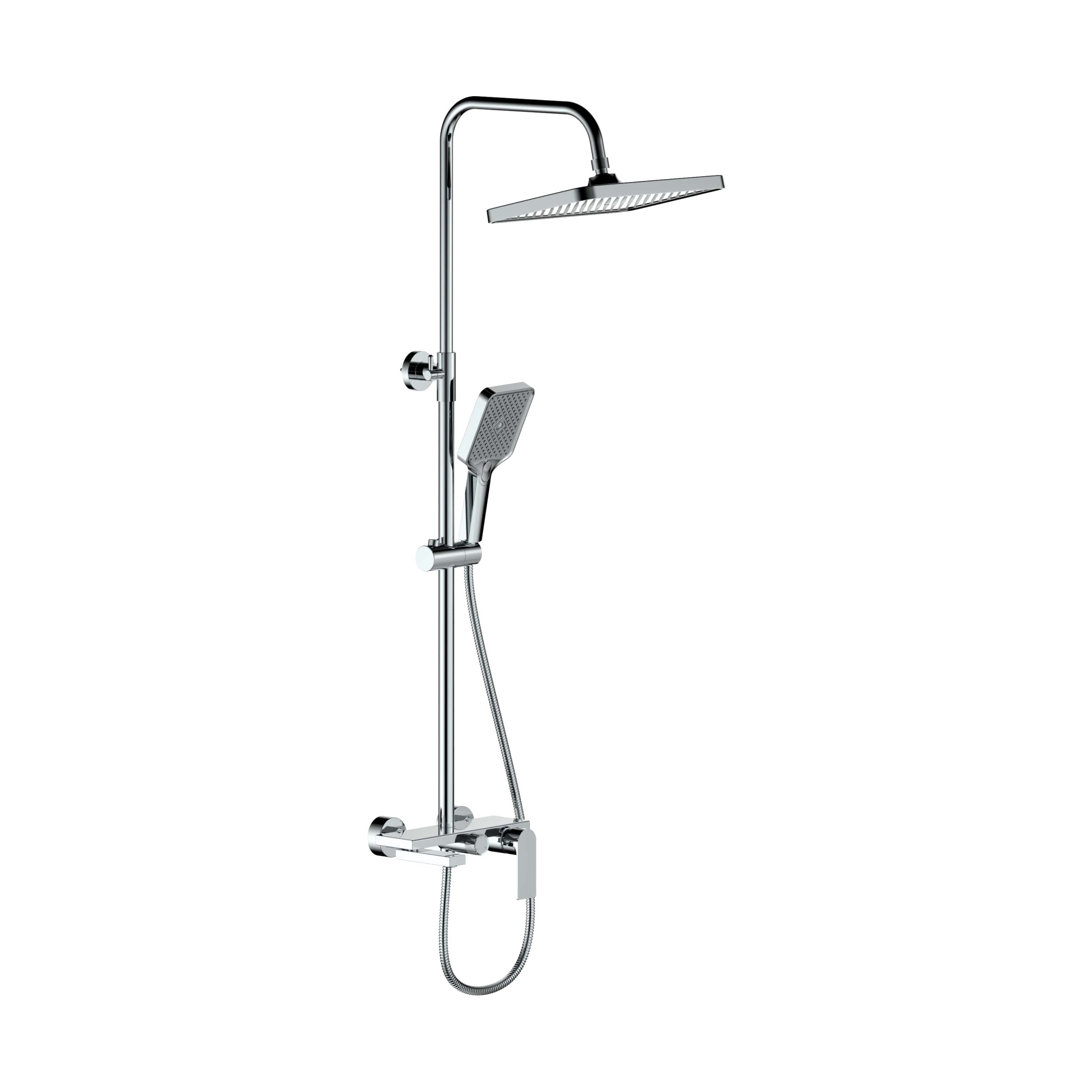 - Комплектация: смеситель, верхний душ, душевая лейка, держатель душевой лейки, шланг, стойка