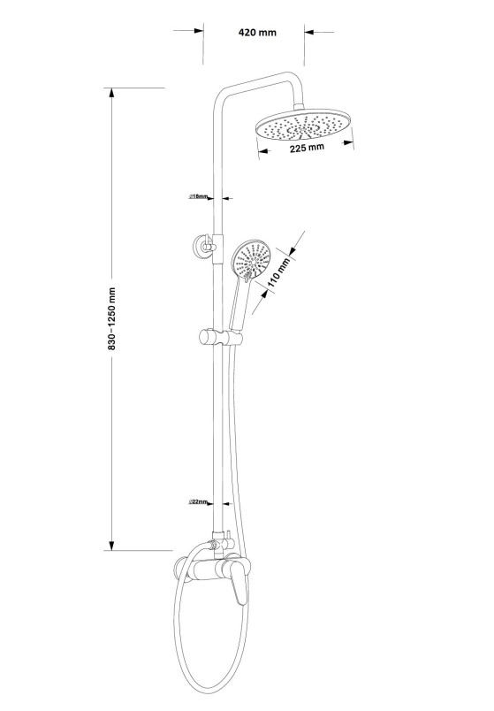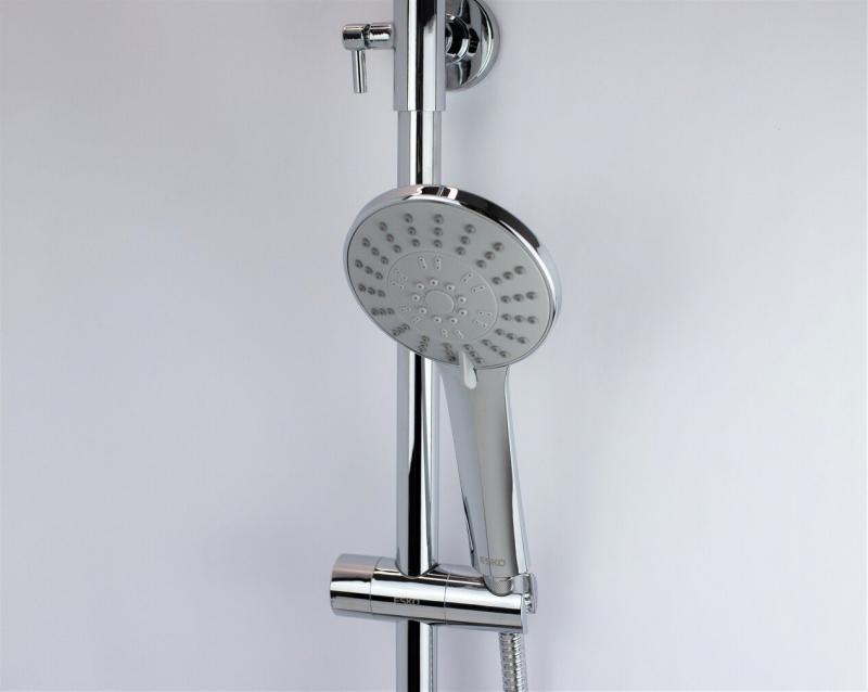 Выдвижная телескопическая стойка(нерж. сталь, хром): высота функциональная 900 -1200мм , диаметр 24мм ,вылет верхнего душа 420мм ,держатель ручной лейки плавающий FightFix Лейка верхнего душа(ABS-пластик,хром) : на подвижном шарнире, диаметр 225мм, Форсунки Self-Clean Device, Eco system Ручная лейка: диаметр 110мм, 5 режимов, Форсунки Self-Clean Device, Eco system Cмеситель латунный без излива: картридж универсальный 35мм , переключатель отдельный двухканальный (ручной душ - верхний душ), Комплектация: душевой шланг 150см (в металл. оплетке), монтажный комплект
