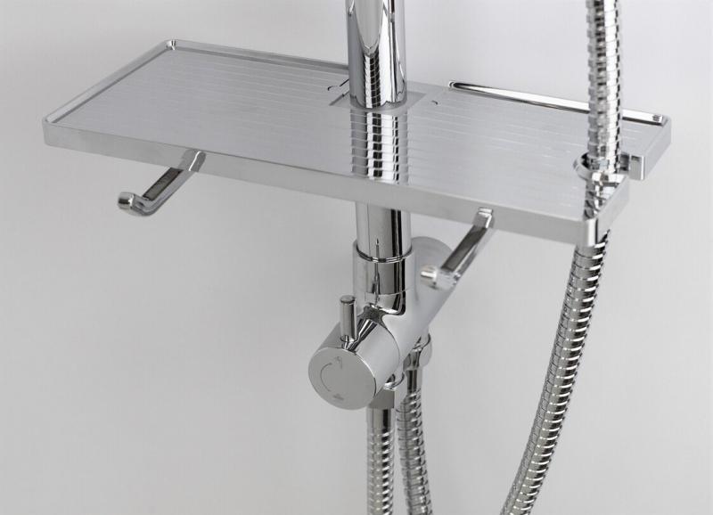 Выдвижная телескопическая стойка(нерж. сталь, хром): высота функциональная 1000 -1300мм , диаметр 25мм ,вылет верхнего душа 310мм ,держатель лейки плавающий FightFix Лейка верхнего душа(ABS-пластик,хром) : на подвижном шарнире, диаметр 226мм, Форсунки Self-Clean Device, Eco system Ручная лейка: диаметр 110мм, 3 режима, Форсунки Self-Clean Device, Eco system Переключатель с ручного на верхний душ: керамика, в латунном корпусе Комплектация: душевой шланг 150см и шланг для подкл. к смесителю (в метал. оплетке), подвесная хромированная полка с крючками для полотенец, монтажный комплект
