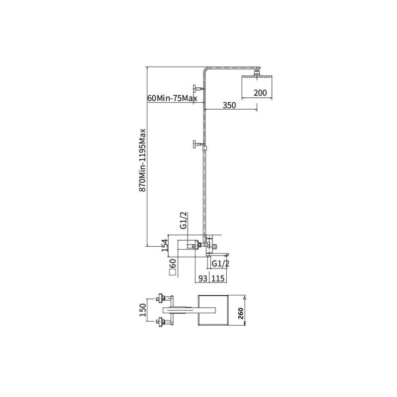 верхняя лейка: чёрная ABS, квадратная 200х200 мм