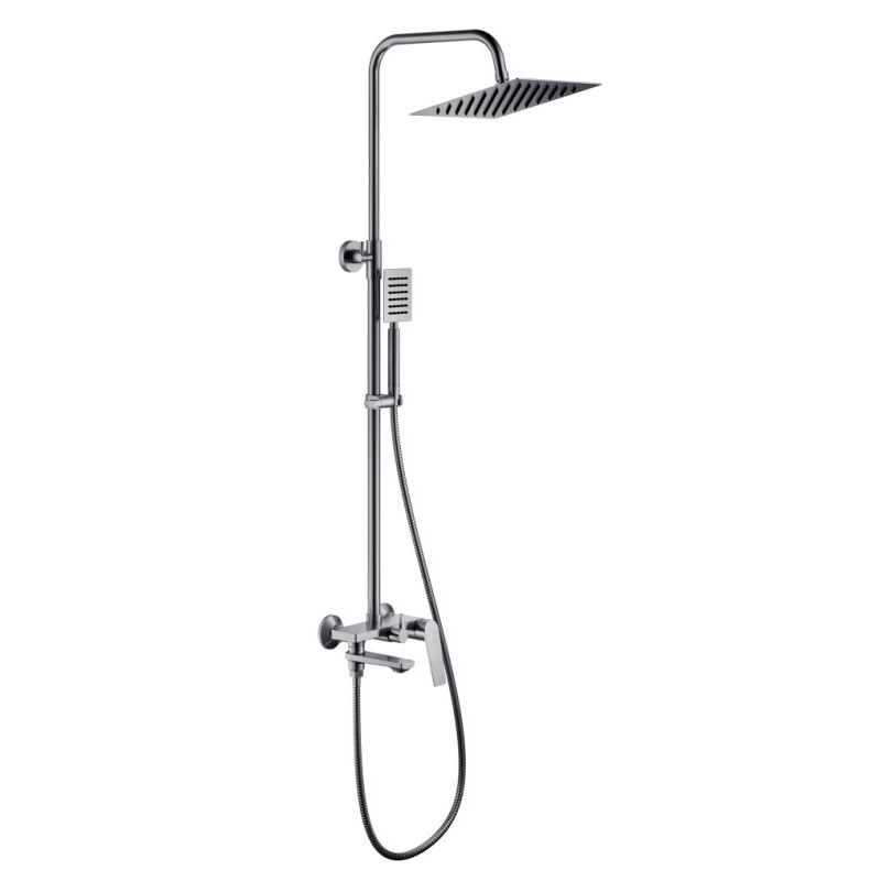 - Комплектация: верхний душ, душевая штанга, держатель душевой лейки, ручной душ, смеситель, шланг