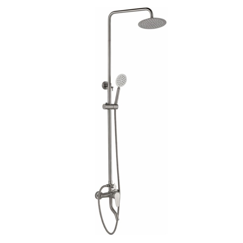 - Комплектация: верхний душ, душевая штанга, держатель душевой лейки, ручной душ, смеситель, шланг