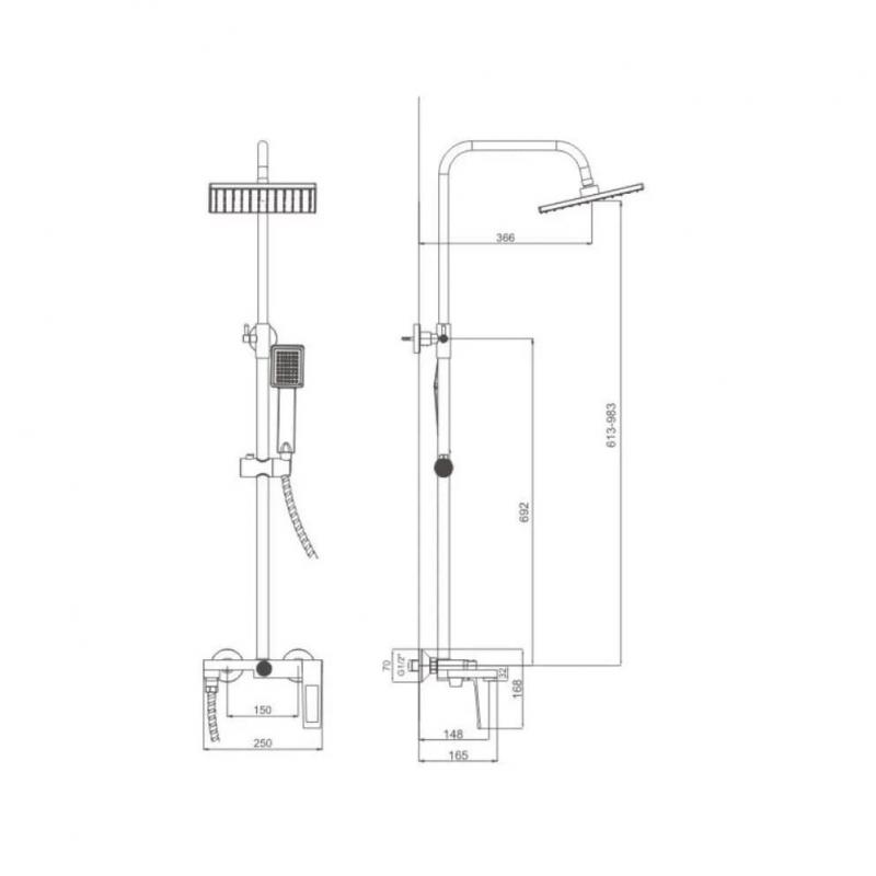 - Комплектация: верхний душ, душевая штанга с держателем лейки, ручной душ, смеситель, шланг