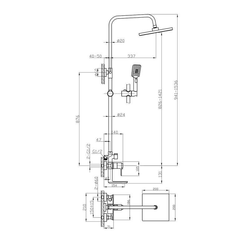 Смеситель термостатический Rossinka RS50-46 для ванны и душа с регулируемой высотой штанги, поворотным изливом и лейкой "Тропический дождь" в интернет-магазине Водолей Сергиев Посад