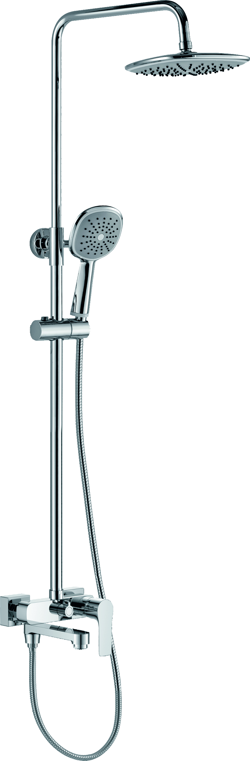 В комплекте 1- режимная душевая лейка, 1-режимный тропический душ, изготовленный из современной прочной пластмассы с никель-хромированным покрытием, душевая штанга раздвижная, держатель душевой лейки поворотный, душевой шланг с латунными гайками 150см, смеситель, индивидуальный пакет, паспорт, гарантийный талон.