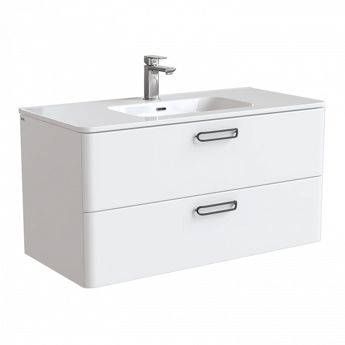 Тумба с умывальником для ванной комнаты, подвесная. Размеры тумбы без умывальника: 467х1002х500 мм (ДхШхВ). Размеры умывальника: 460х1000 мм (ДхШ). Фасад МДФ 19 мм в эмали (белый глянец), фрезеровка. Корпус ЛМДФ 16 мм в эмали. Черные сатиновые ручки. Два выдвижных ящика с механизмом плавного доведения. Пластиковый ограничитель под сифон в верхнем ящике. Перекатной организатор в нижнем ящике. Навесы усиленные с планкой. Упаковка: картон, пленка, пенопластовые уголки.